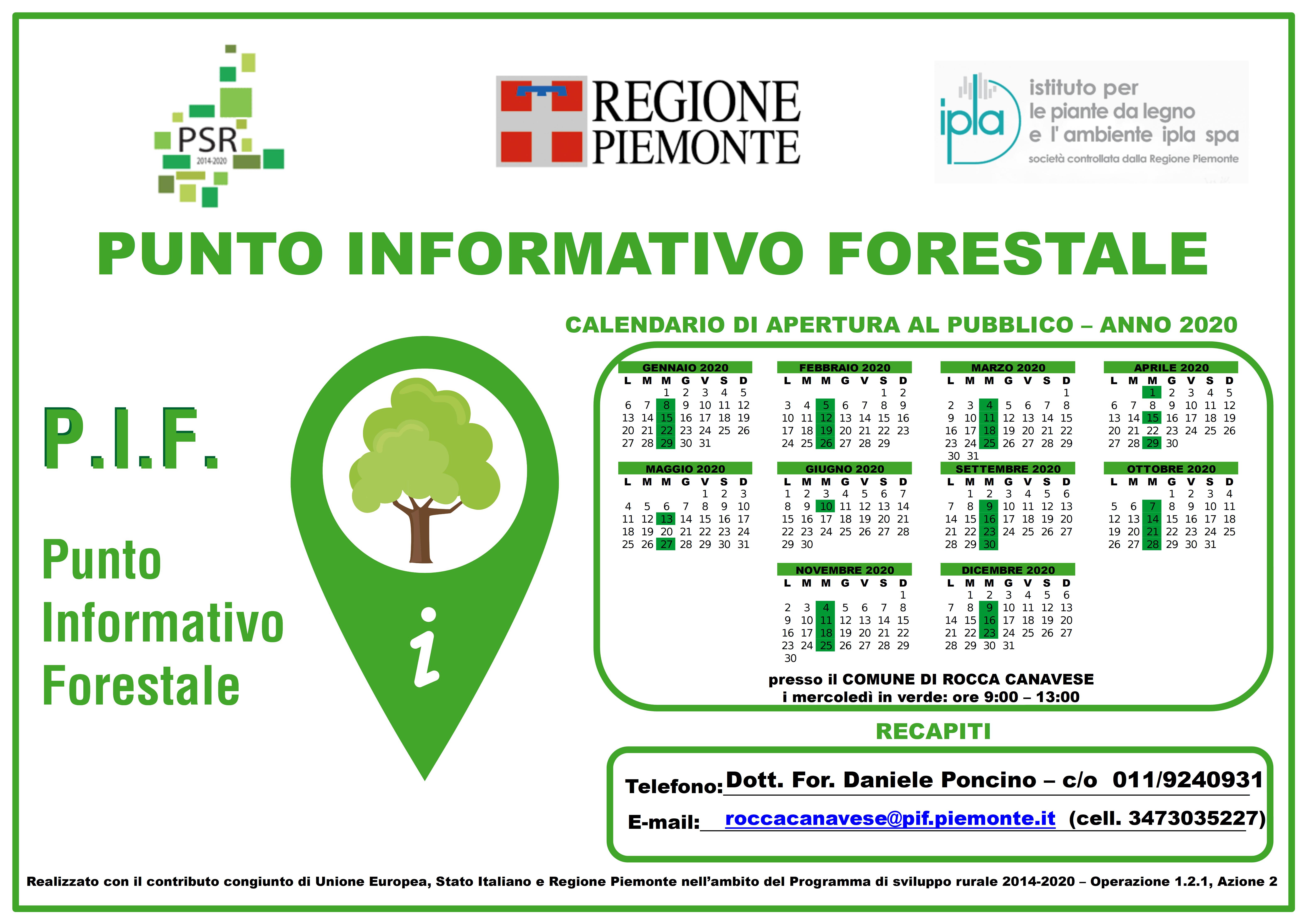 Un tecnico forestale sarà disponibile al mercoledì (nei giorni indicati in verde nel calendario allegato), dalle ore 9:00 alle ore 13:00 per fornire informazioni a imprese e proprietari sulla gestione del bosco e del territorio.