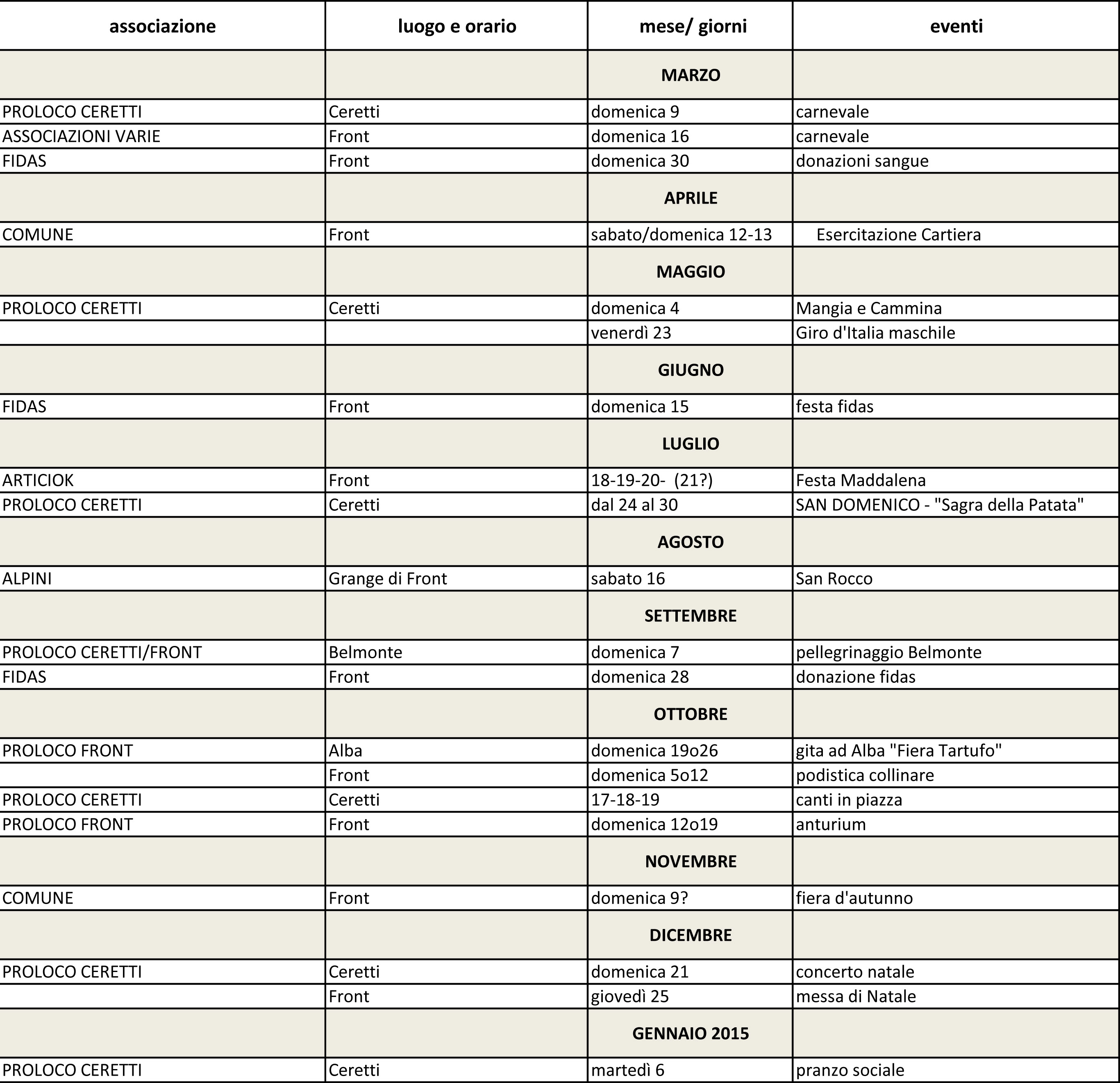 SI PUBBLICA L'ELENCO DELLE MANIFESTAZIONI IN PROGRAMMA PER TUTTO IL 2014